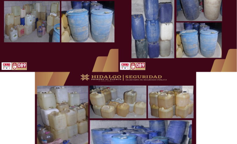 Durante estos trabajos se logró el aseguramiento de aproximadamente 530 litros de combustible, distribuidos en 13 contenedores plásticos tipo bidón, así como 41 contenedores vacíos presuntamente utilizados para su almacenamiento. En el sitio también fueron localizados 10 metros de manguera, comúnmente empleada para la extracción y manejo ilegal de combustible.