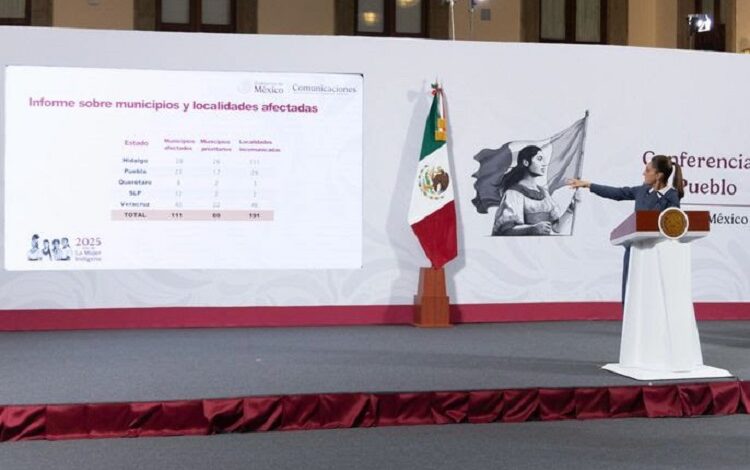 Ciudad de México, 15 de octubre de 2025.- La Presidenta de México, Claudia Sheinbaum Pardo, informó que envió responsables a las zonas afectadas de Veracruz, Hidalgo, Puebla, Querétaro y San Lui Potosí, con la finalidad de continuar con la coordinación entre el Gobierno Federal, los estados y los municipios, para atender la emergencia tras las lluvias extraordinarias.